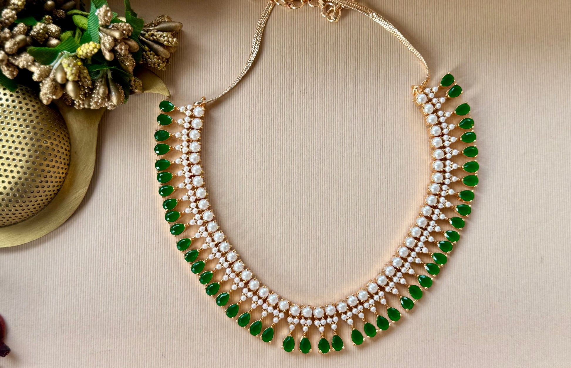 A regal necklace adorned with cascading rows of vivid green stones and lustrous pearls, designed to create an elegant rhythm of color and shine. The matching earrings, crafted in a teardrop silhouette with clustered pearls and a central emerald-toned stone, complete the look with timeless sophistication.