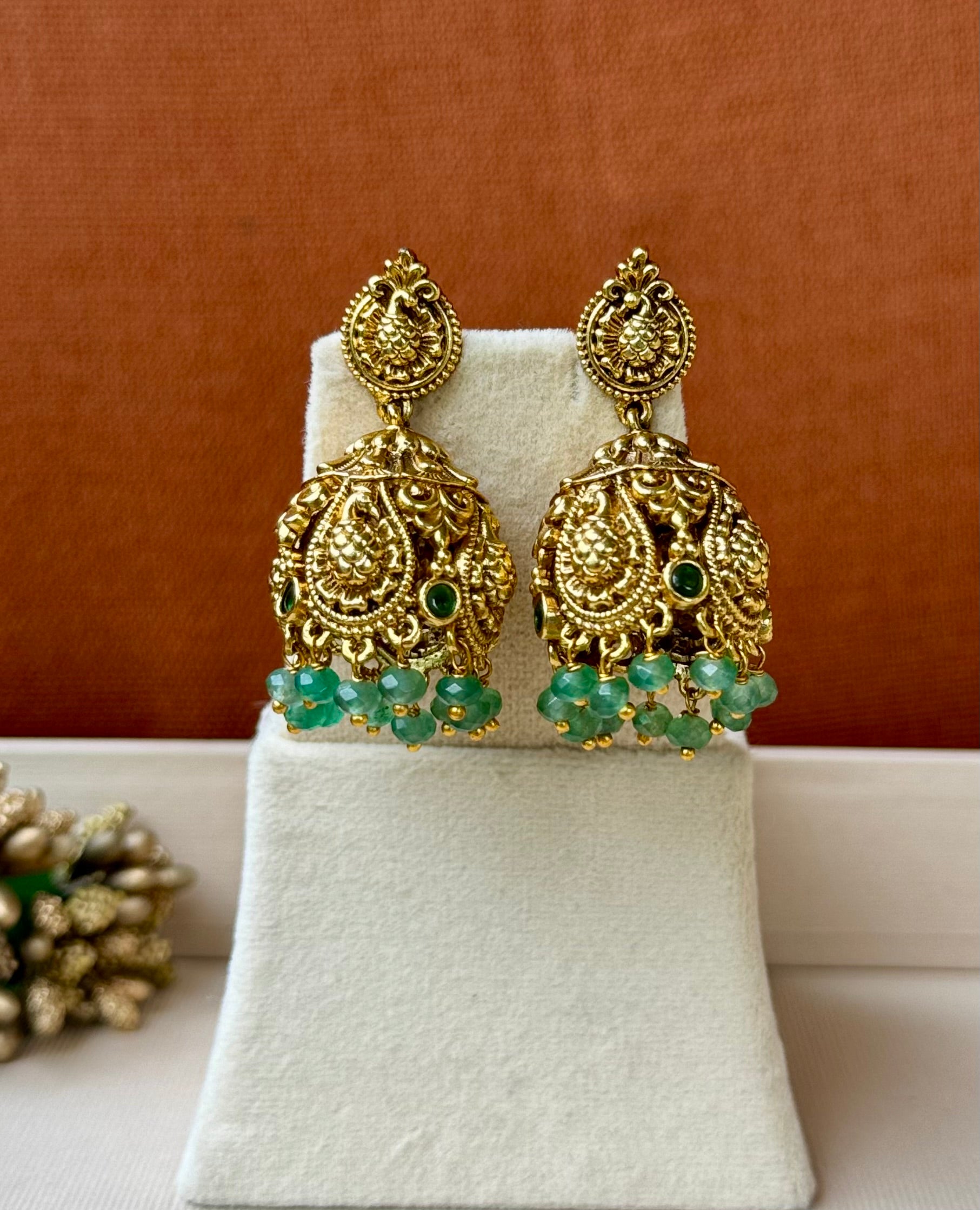 These antique gold jhumkas showcase exquisite nakshi craftsmanship with floral detailing and tiny green stone inlays. Finished with faceted green bead hangings, they blend temple tradition with a hint of modern vibrance.