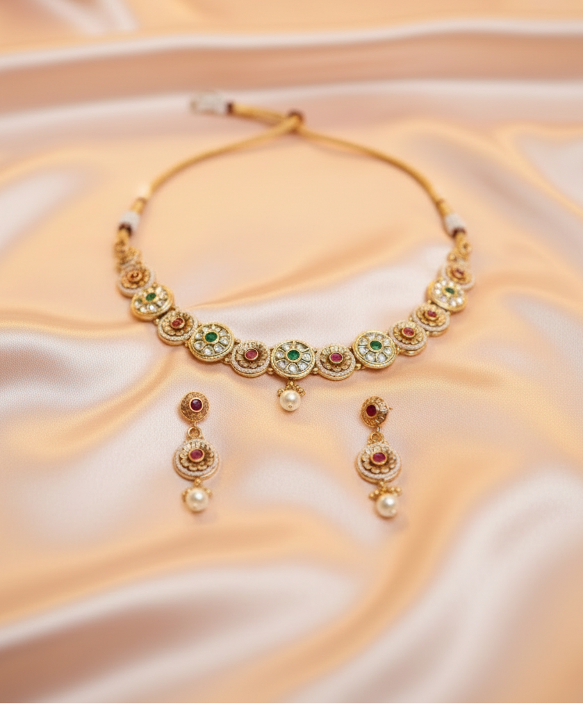 A graceful kundan necklace designed with circular floral motifs accented in pastel green and ruby tones, finished with pearl drops. Paired with dainty matching earrings, this set strikes the perfect balance of elegance and festivity — a timeless addition to your jewellery collection.