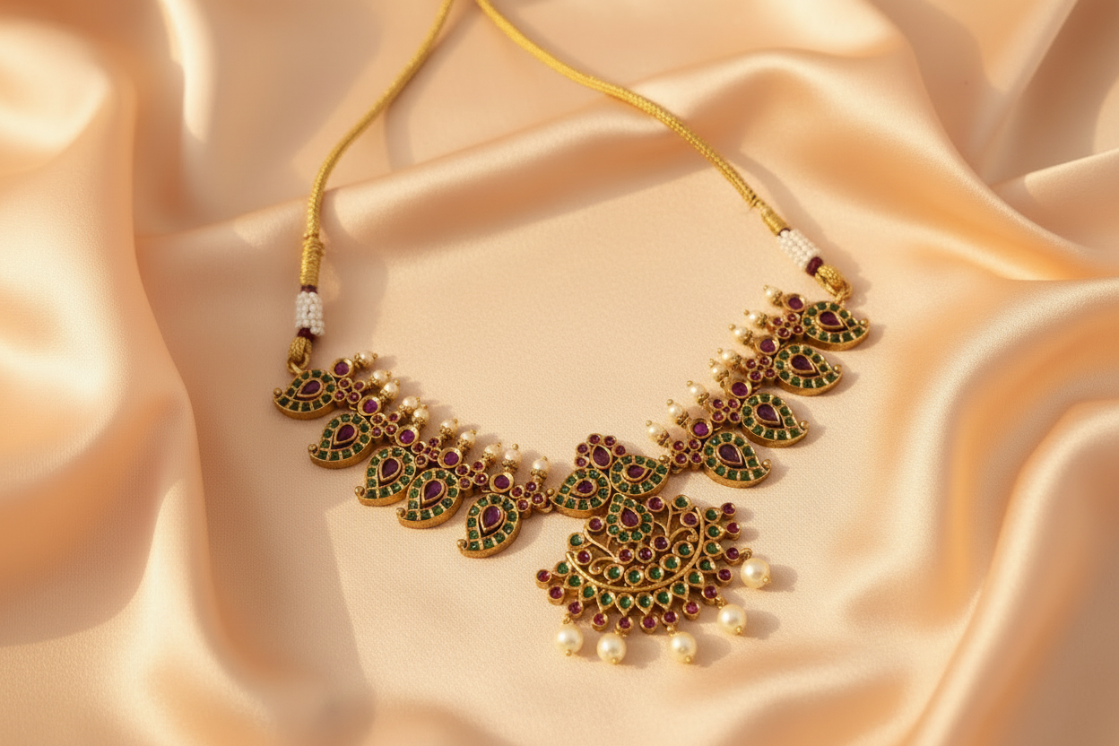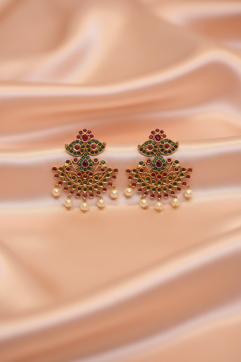A stunning South Indian necklace and earrings set featuring intricate temple-inspired motifs, crafted with ruby-red and emerald-green stones. Finished with pearl hangings, this set reflects the grandeur of heritage temple jewellery while staying wearable for modern celebrations.