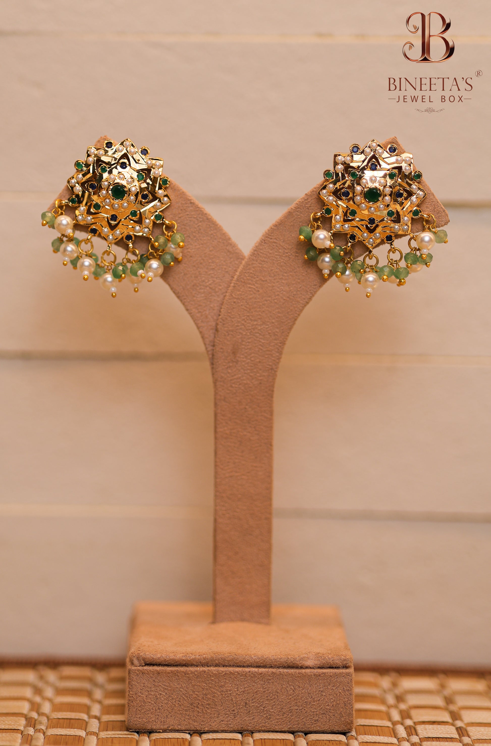 A striking choker with a bold circular medallion centerpiece, highlighted with green bead accents and pearl drops. The grand matching earrings mirror the design, making this set a true statement piece for festive and bridal wear.