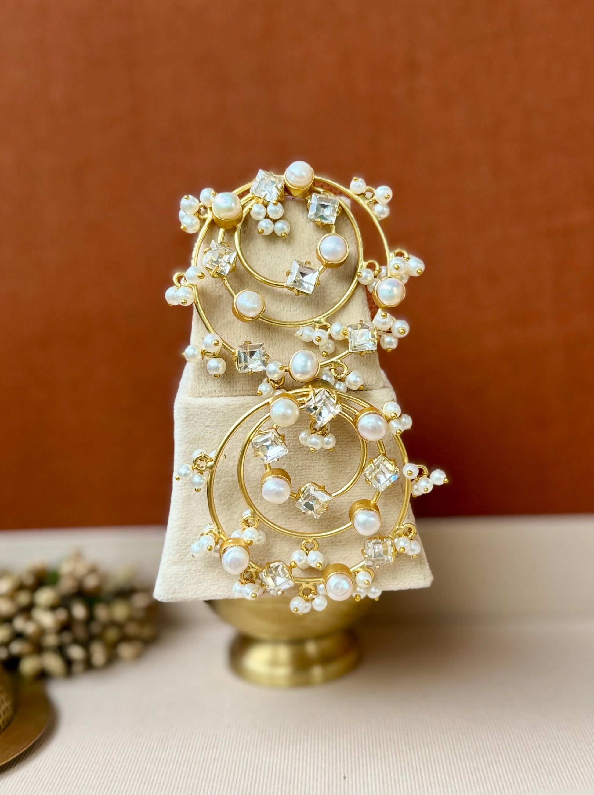 Statement double-hoop earrings crafted in a fine antique-gold finish, adorned with luminous pearls and sparkling crystal accents. The layered circular design creates graceful movement and a refined festive sparkle, blending modern elegance with timeless charm.
