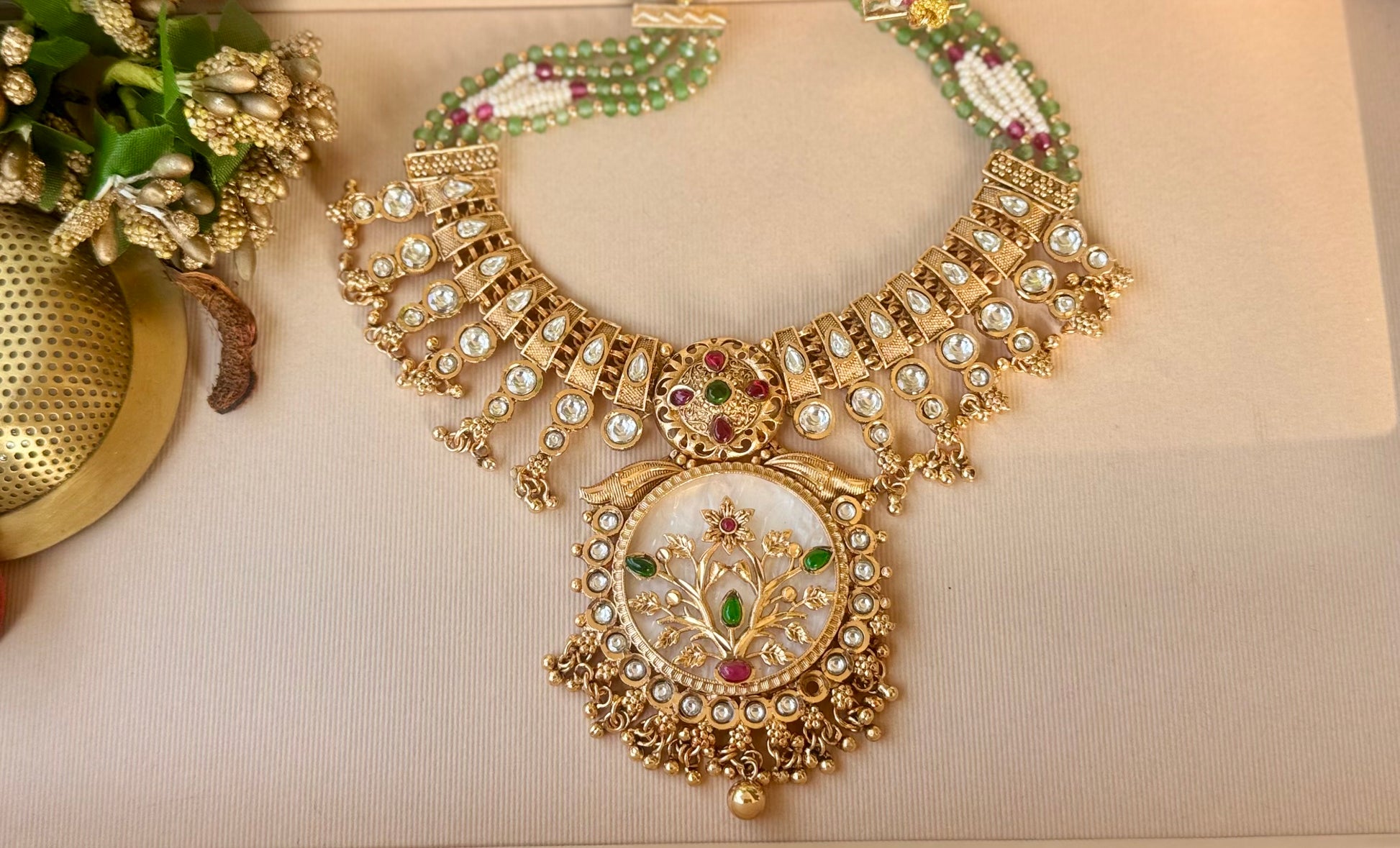 A regal statement set featuring intricate meenakari-style detailing with soft mother-of-pearl accents, ruby and emerald tones, and antique gold craftsmanship. The bold pendant and matching earrings create a rich heritage look with graceful movement and traditional charm.
