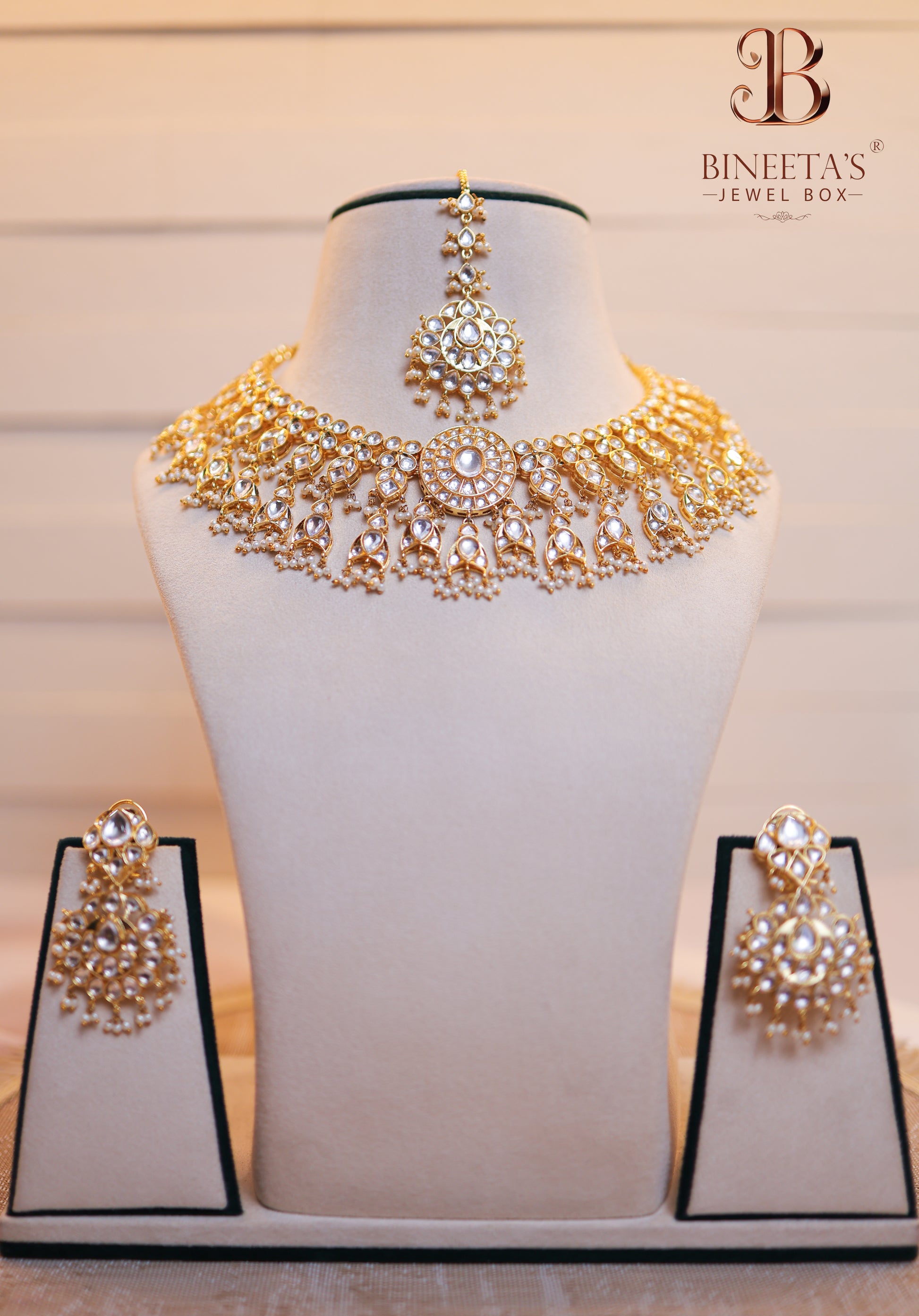 Aabhaar is a statement kundan set, crafted with rows of hand-set stones and a regal circular motif at the center. Accented with clusters of pearl drops and intricate jali work, the set exudes heritage charm with refined elegance. The matching chandbali-style earrings complete this majestic look.