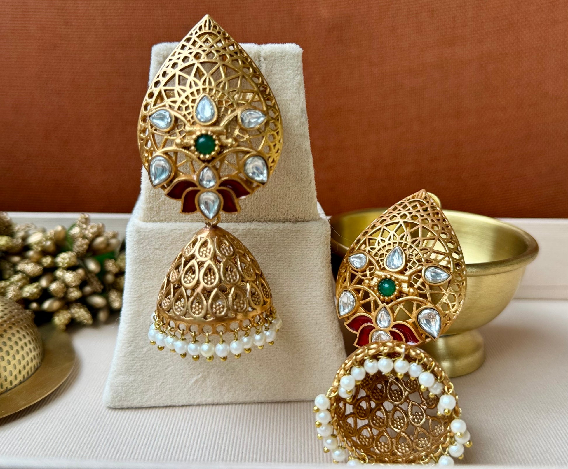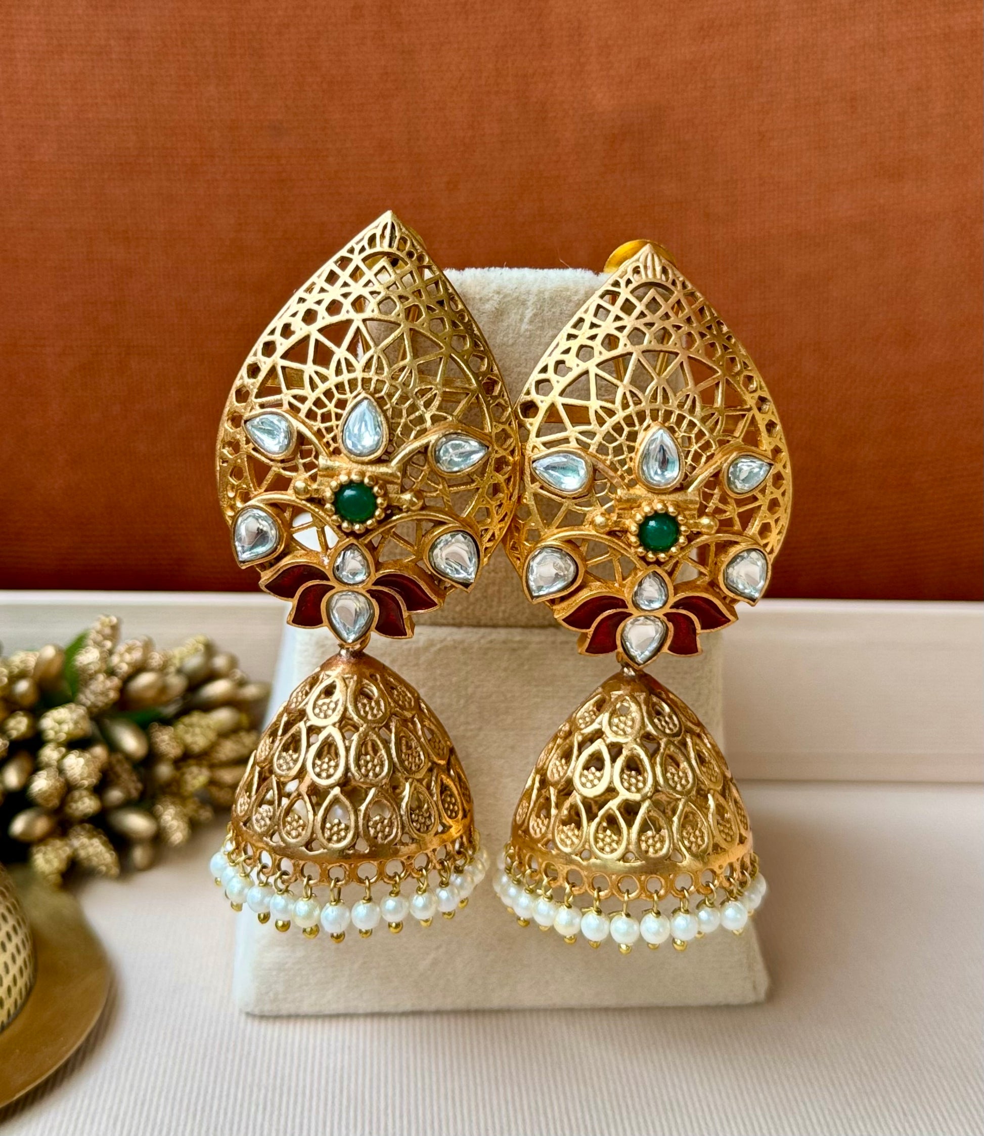 Exquisitely handcrafted jhumkas featuring an intricate filigree lattice top adorned with uncut Kundan stones and enamel accents. The golden dome is detailed with paisley motifs and finished with a row of dainty pearl drops, adding an ethereal charm.