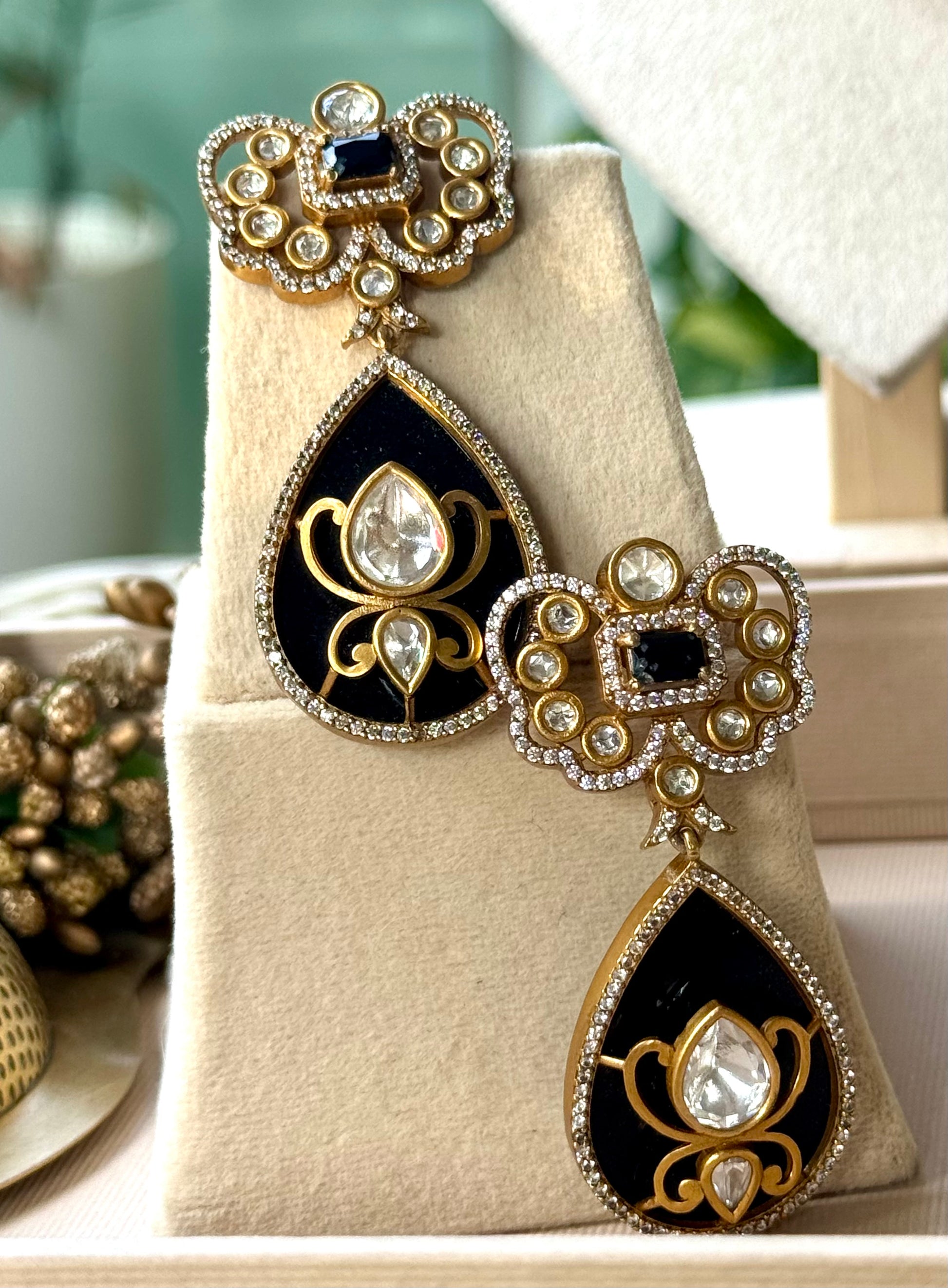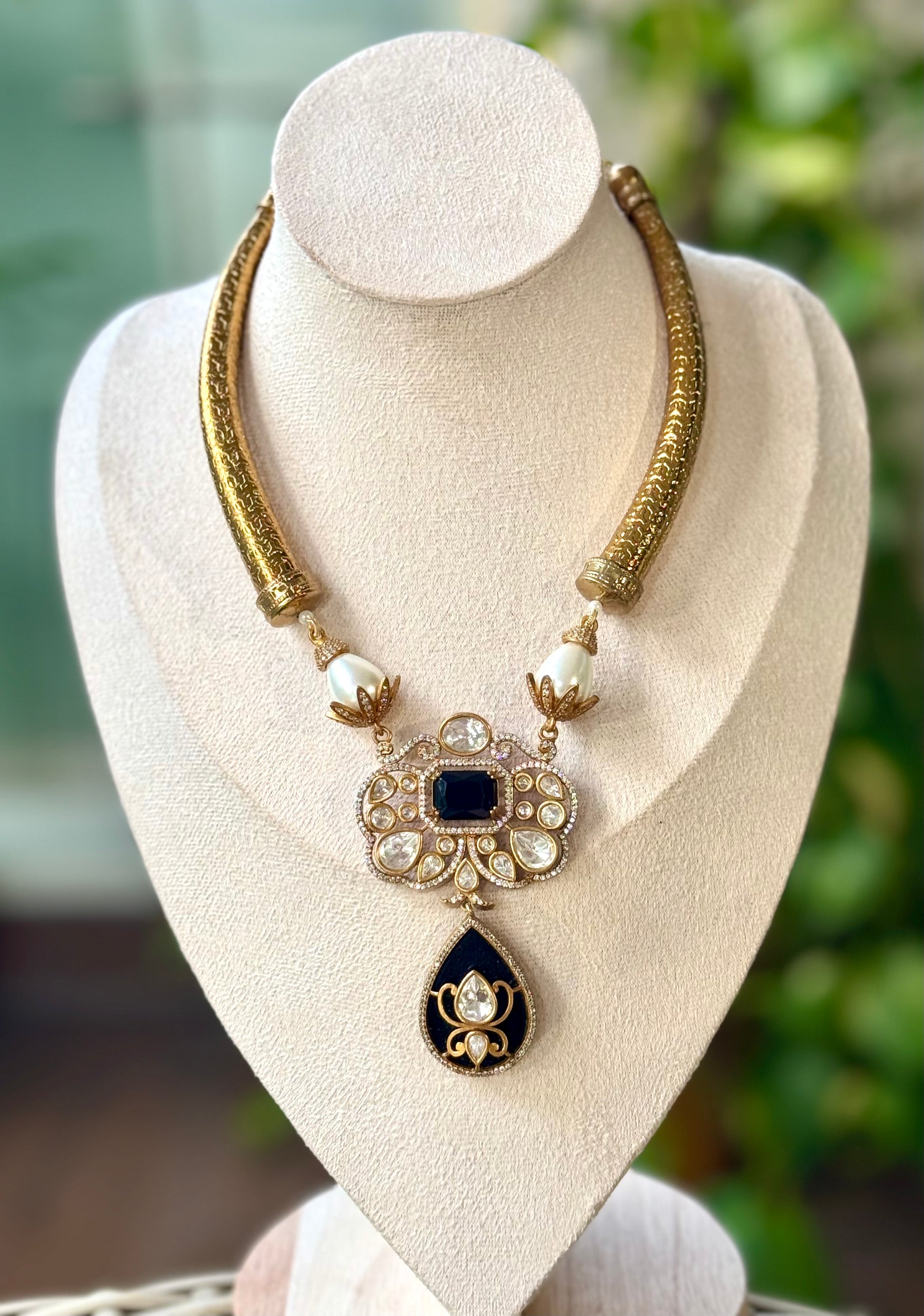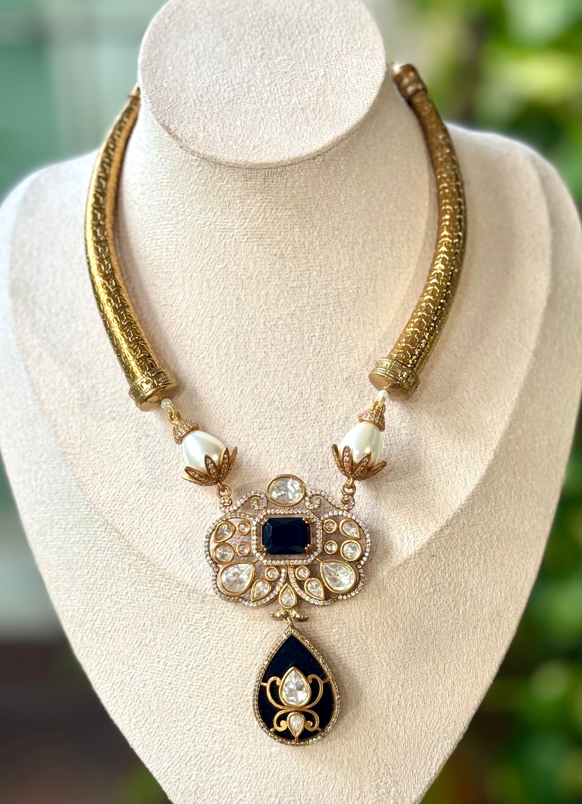 A striking necklace and earring set crafted with bold black stone, radiant kundan-style stones, and antique rusted gold finishing. The unique teardrop motifs with pearl accents make it a statement piece that blends heritage artistry with modern sophistication.