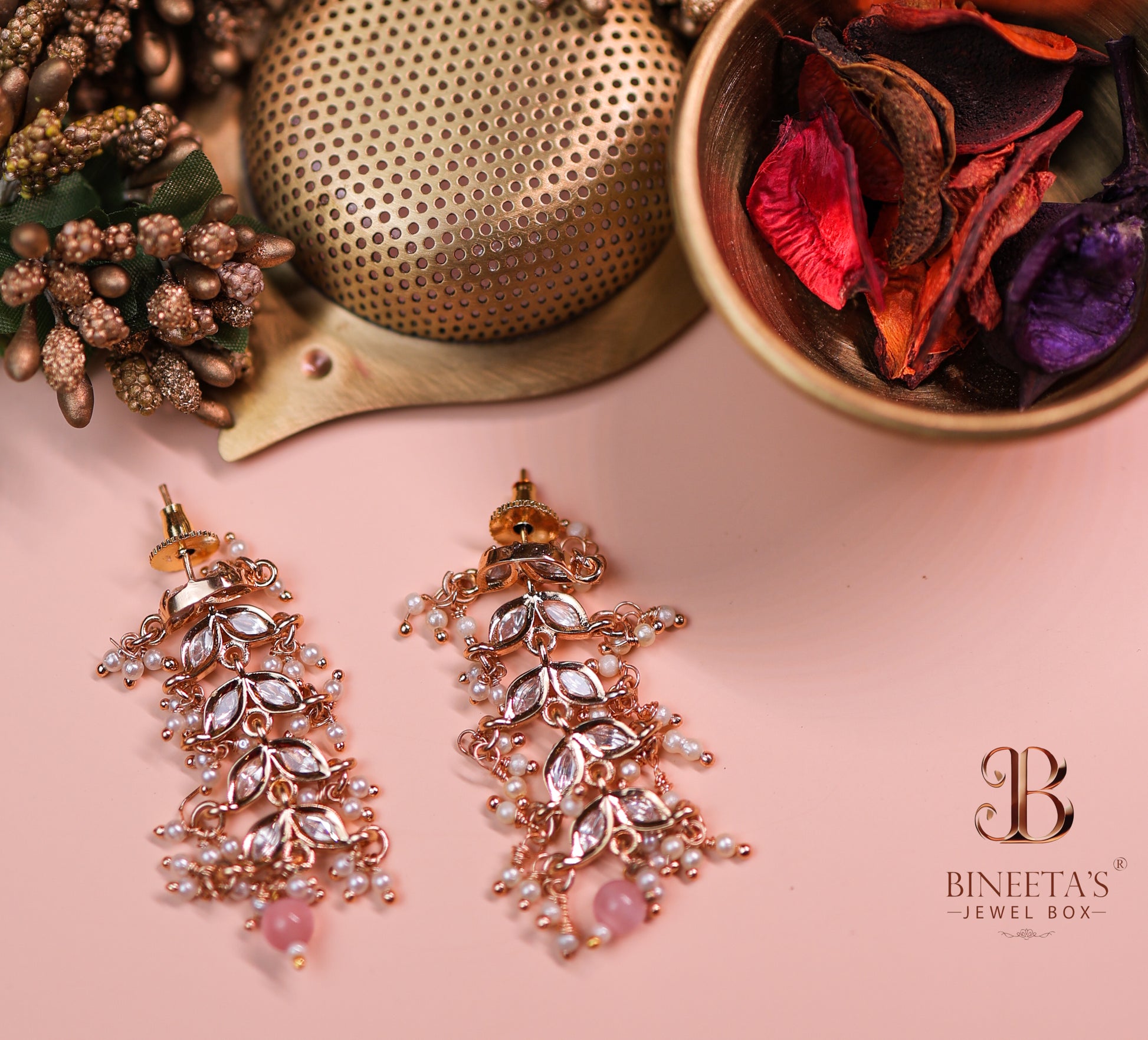 Delicate and dreamy, Gulbahar Grace is a pastel kundan necklace inspired by blooming spring gardens. Handcrafted with leaf-shaped mirror-cut kundan pieces, the necklace is adorned with soft pink and mint green faux stones and petite clusters of off-white pearls. The earrings have beautiful pink and white stones. Its lightweight design and refreshing hues make it a perfect choice for both day celebrations and intimate festivities.