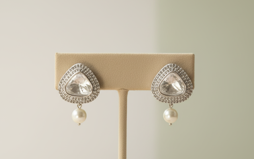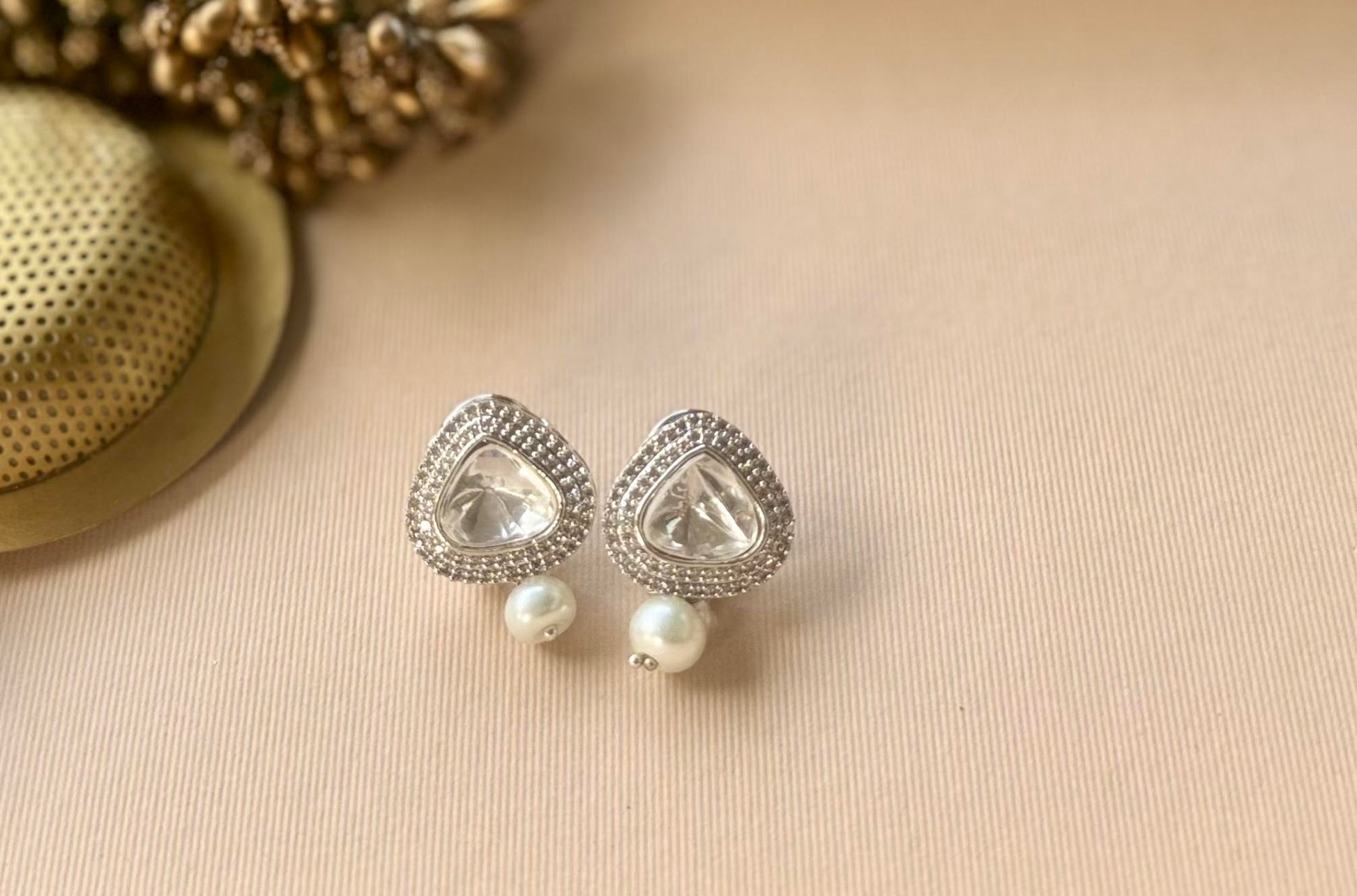 Understated yet striking, the Sia Studs feature a luminous triangle-cut stone encased in fine silver detailing and finished with a single pearl drop. Their sleek design adds a touch of sophistication, making them the perfect everyday-to-evening accessory for the modern woman who appreciates subtle luxury.