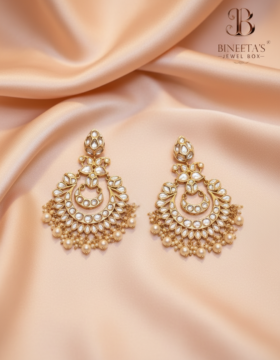 These grand kundan chandbalis feature intricate layers of stonework in a cascading circular design, finished with delicate pearl hangings. Radiant and timeless, they embody the elegance of royal heritage while staying versatile for modern celebrations.